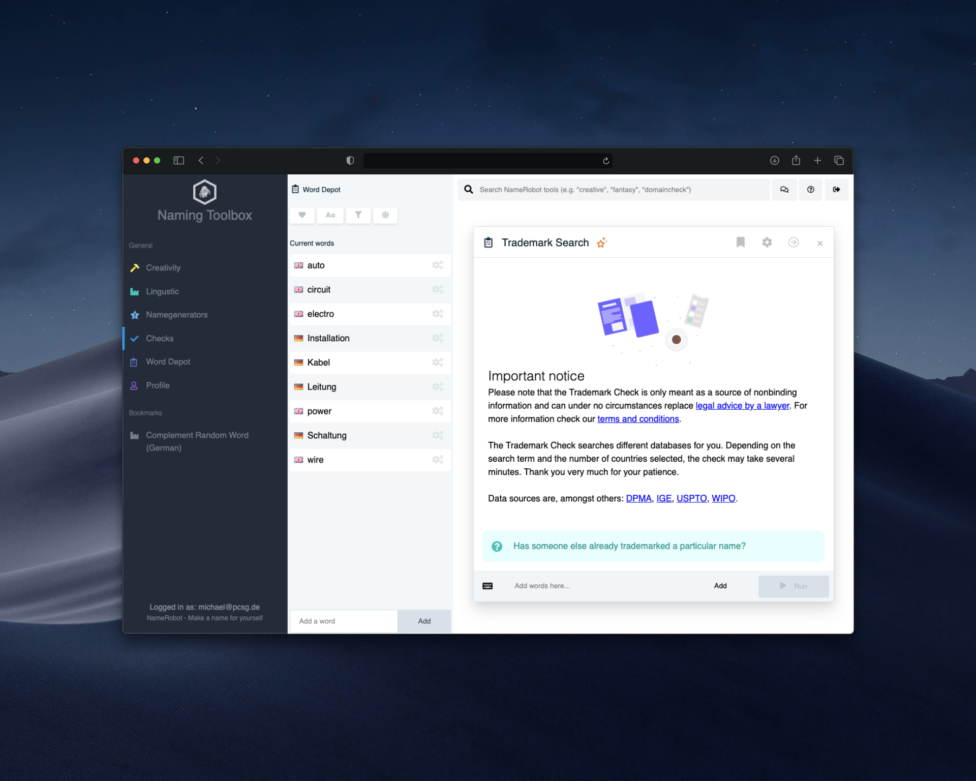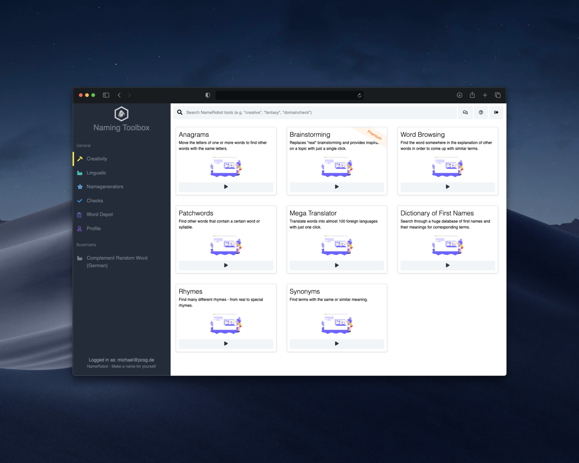 NameRobot’s Toolbox is the most comprehensive naming platform out there. It’s like having a full naming agency in your browser - at a fraction of the cost.